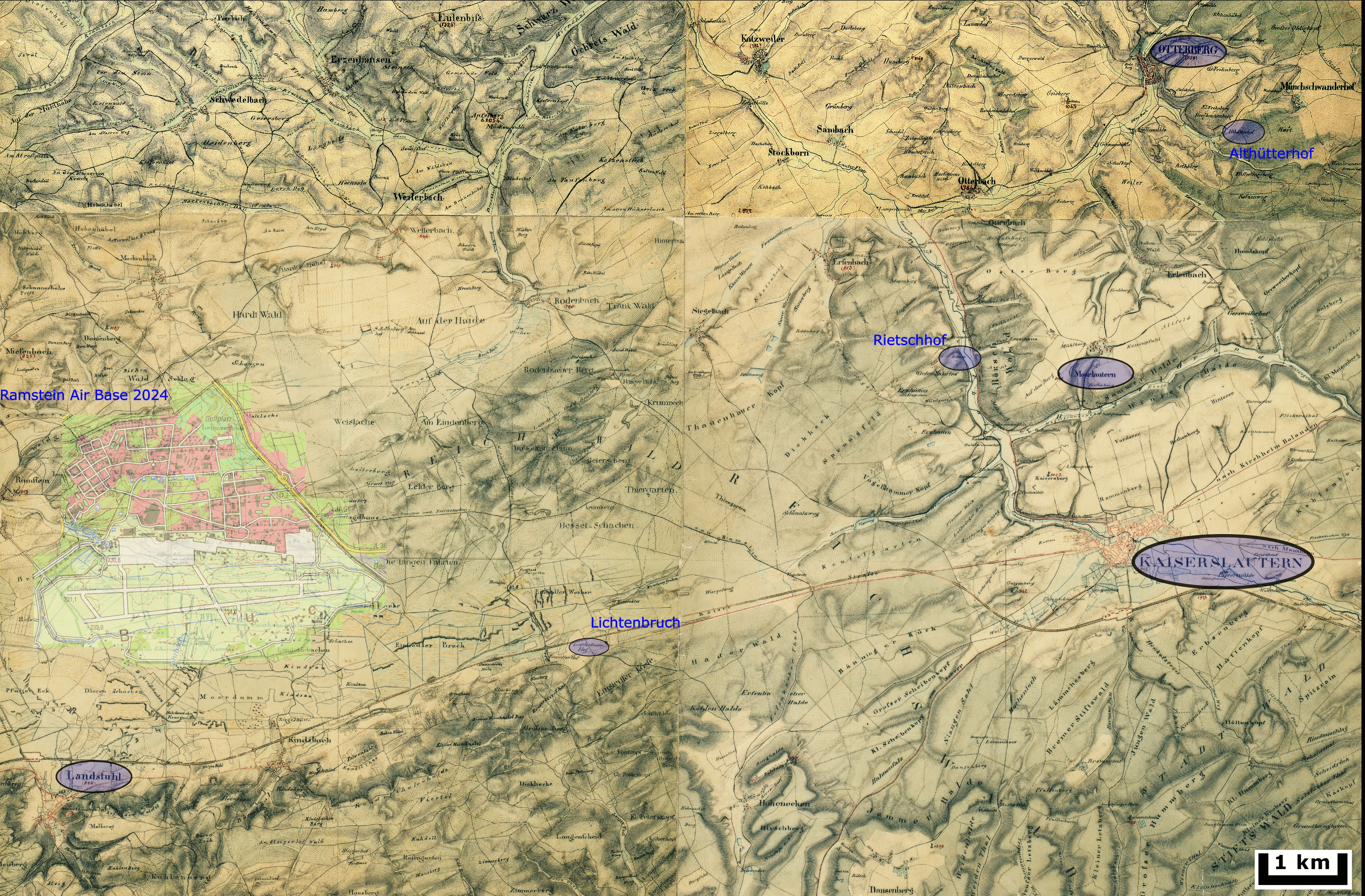 Kaiserslautern, Otterberg und Umgebung in der Karte der pfälzischen Gebiete Bayerns (1836-1841) (Quelle: BORIS - Bodenrichtwertinformationssystem Rheinland Pfalz)