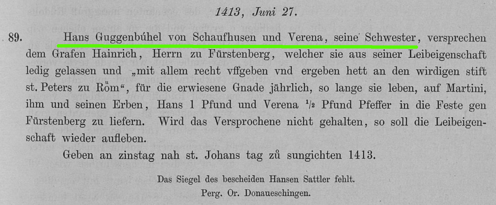 Im Abschnitt zur Region Baar werden an Hand verschiedener Dokumente aus dem "Fürstenbergischen Urkundenbuch" einige Ereignisse aus verschiedenen Generationen einer Familie Guggenbúhel zwischen 1312 und 1414. Eines dieser Dokumente schildert, dass am 27. Juni 1413 Hans Guggenbúhel von Schaufhusen und seine Schwester Verena von Graf Hainrich, Herr zu Fürstenberg, gegen Zahlung von jährlich 1 ½ Pfund Pfeffer aus der Leibeigenschaft entlassen werden. "Schaufhusen" ist eine alte Bezeichnung für Schaffhausen am Oberrhein, das etwa 30 km entfernt von Neudingen und etwa 18 km entfernt von Tengen liegt. Da es in der damals doch recht kleinen Bevölkerung von Fürstenberg wohl kaum zwei Familien mit dem Namen Guggenbühl gab, kann man davon ausgehen, dass die Schaffhauser Familie mit jener verwandt war, auf die sich die im Abschnitt zur Region Baar besprochenen Dokumente beziehen.